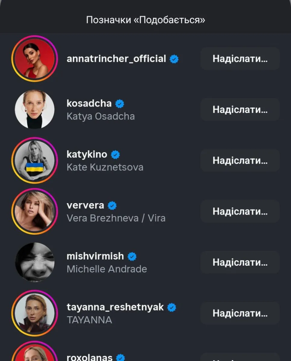 Серед вподобайок – відомі зірки українського шоу-бізнесу: Анна Трінчер, Катя Осадча, Тетяна Решетняк (TAYANNA), Катерина Кузнецова, Віра Брєжнєва, Мішель Андраде.
