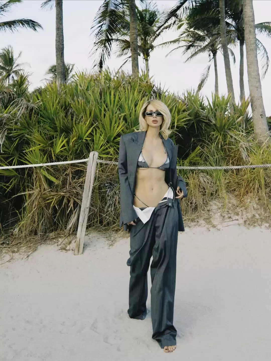 Зірка попозувала на пляжі у срібному бікіні, сірому піджаку та розстібнутих штанях.