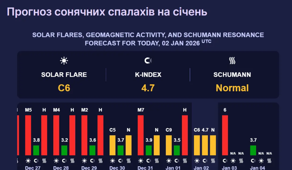 За прогнозами спеціалістів, 3 січня магнітна буря досягне червоного рівня з індексом К на позначці шість. Такий рівень магнітної бурі може викликати головний біль та загальну втому.