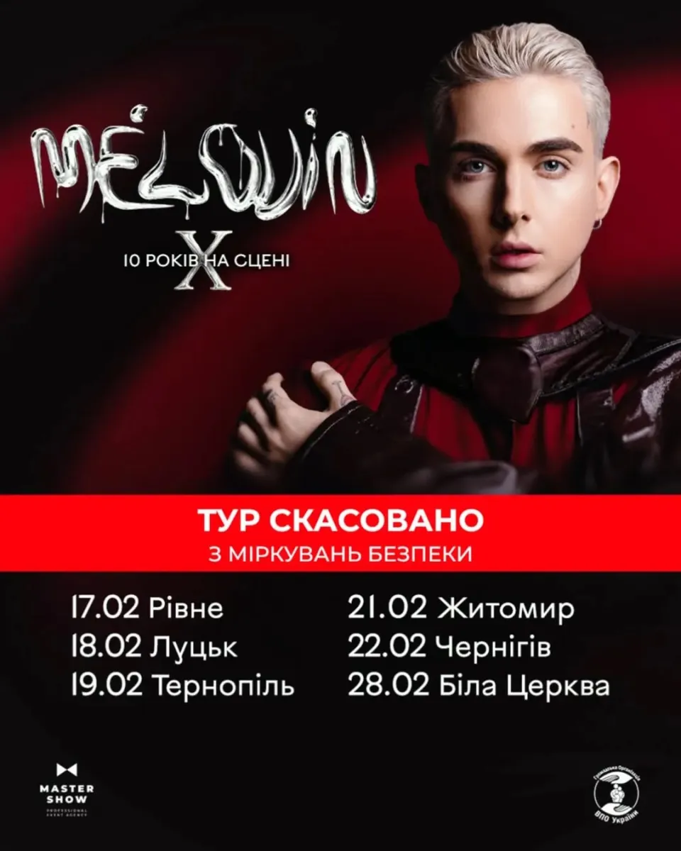 Відомий український артист MELOVIN не виступить з концертами в містах країни після події в Рівному, де його шоу було зірвано невідомими особами. Команда Master Show повідомила про скасування через Instagram. У заяві йдеться, що концерти в Луцьку, Тернополі, Житомирі, Чернігові та Білій Церкві не відбудуться з причин безпеки.