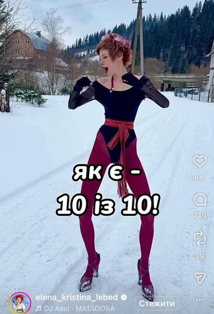 На відео Лебідь з’явилася посеред гірського пейзажу у чорному боді з рукавами-сіточками, бордових колготках і на високих підборах. Образ доповнило чільце — традиційний український головний убір, що додав кадрам етнічного акценту. Попри сніг під ногами, телеведуча впевнено рухалася, влаштувавши запальний танець просто неба.