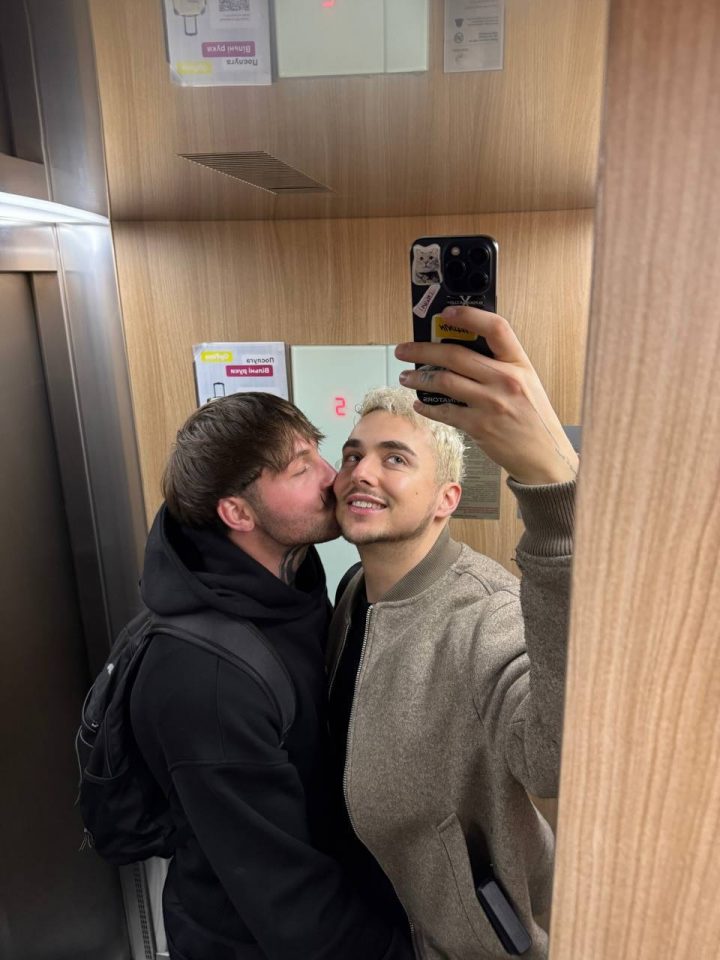 На нових фото пара позує в ліфті — саме там закохані зробили кілька щирих селфі. На одному зі знімків Петро ніжно цілує співака в щоку, а MELOVIN  широко усміхається, ніби й досі переживає момент щастя, який пов’язаний із несподіваною пропозицією руки й серця. Обидва виглядають надзвичайно закоханими та сяючими.