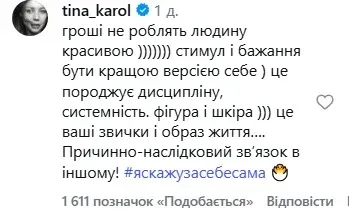 Тіна Кароль, у своєму коментарі, заперечила цю думку, стверджуючи, що краса не є наслідком фінансових можливостей. З її точки зору, важливіше мати стимул і бажання працювати над собою. Саме це, на думку співачки, формує системний підхід до догляду за собою.
