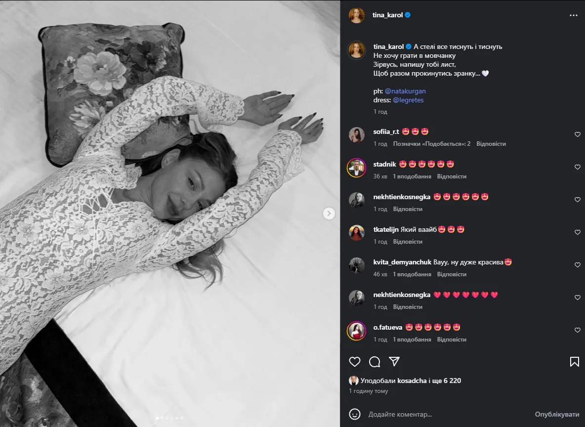 Українська співачка Тіна Кароль поділилася новим дописом в Instagram, який одразу викликав хвилю емоцій серед її шанувальників. На чорно-білому фото артистка лежить на ліжку, усміхнена, у мереживному вбранні, з руками, простягнутими над головою.