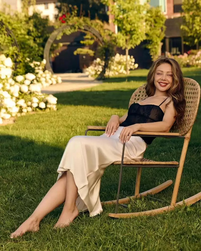 Для зйомки Тіна позувала в саду у кріслі-гойдалці. Вона обрала мереживний чорний топ і довгу спідницю молочного відтінку.